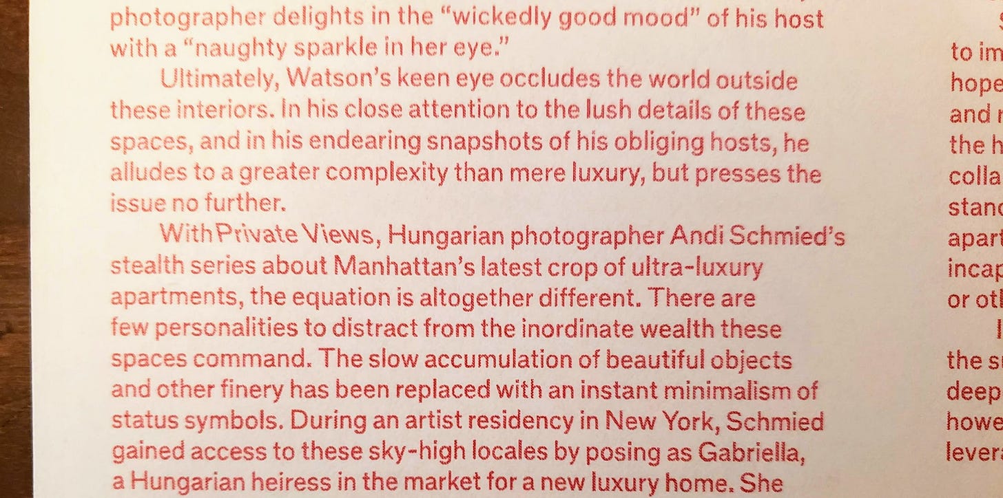 Lane Rick reviews the two books, The Lives of Others: Sublime Interiors of Extraordinary People, and Private Views: A High-Rise Panorama of Manhattan, to question the innocence of “our consumption of the lifestyles of the mega-rich."